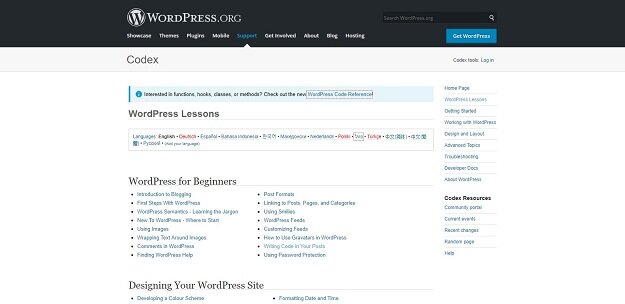 WordPress Lessons are the best resource to look into when it comes to getting started with WordPress. You just have to launch WordPress Codex to find the resources. You need not go anywhere else as it covers everything for beginners as well as advanced-level users.